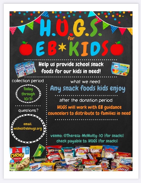 - EB HUGS Collects Snacks for StudentsNow through October 31, 2025, EB HUGS is hosting a Snack Drive. The goal is to provide nutritious snacks and non-perishable food items to food insecure households, especially during weekends and school holidays when school meals are not available. We will collect donations and distribute them, cooperating with the schools to send the items home⦠Read more: EB HUGS Collects Snacks for Students