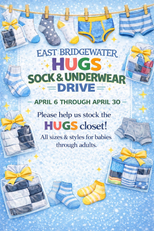 - EB HUGS 1ST ANNUAL SOCKS AND UNDERWEAR DRIVEApril 6 to April 30, 2026Due to the overwhelming requests for these necessities, we are doing a collection drive to help stock up.Please join us in the collection of new socks and underwear for all ages babies through adult sizes. We are looking for all styles and sizes. Venmo, check and cash donations are also… Read more: EB HUGS 1ST ANNUAL SOCKS AND UNDERWEAR DRIVE